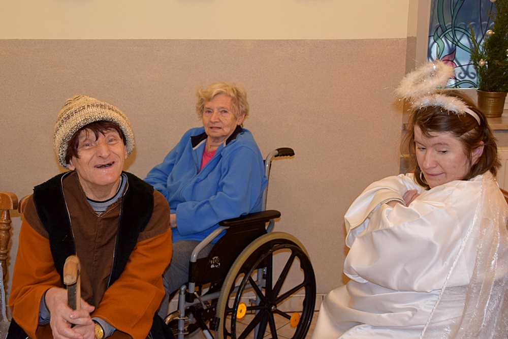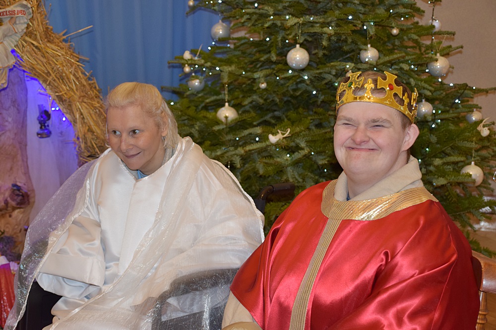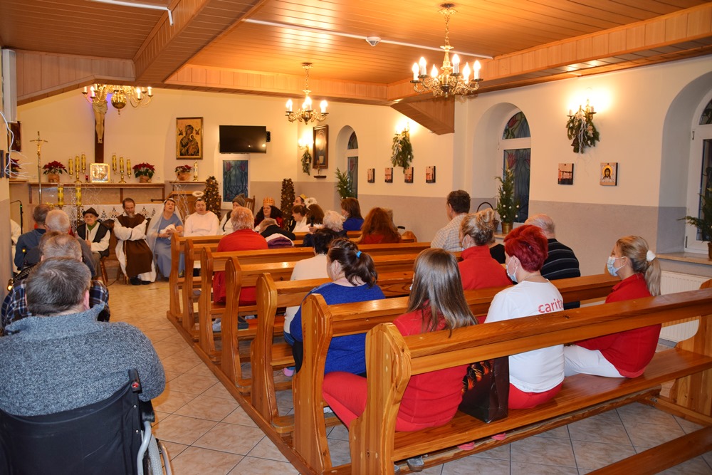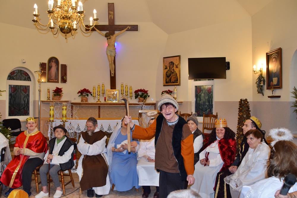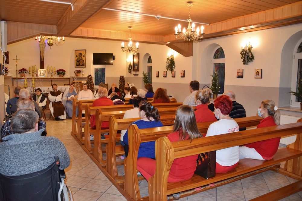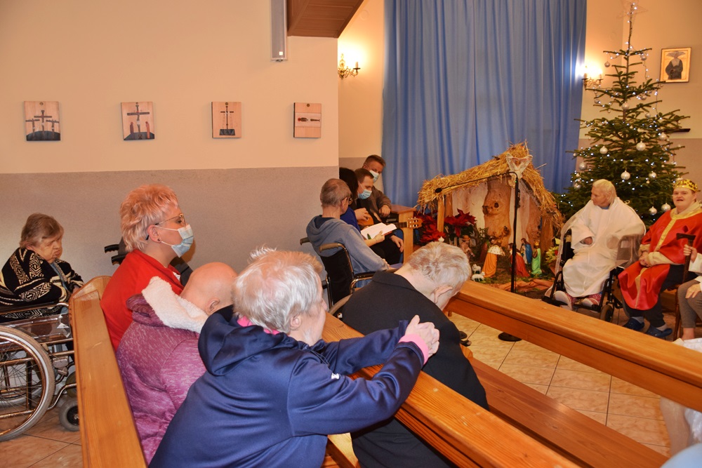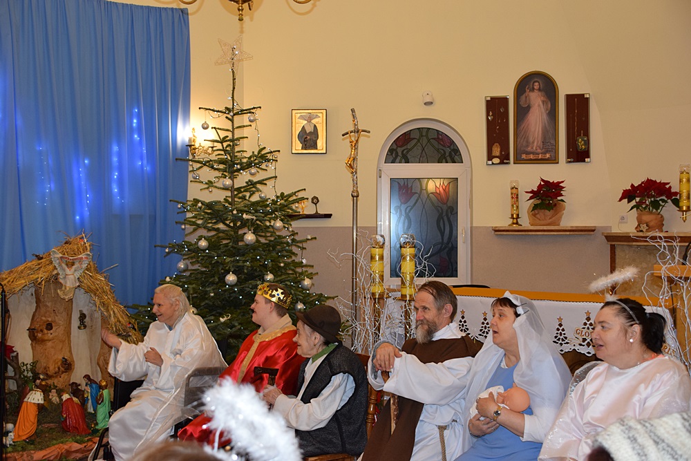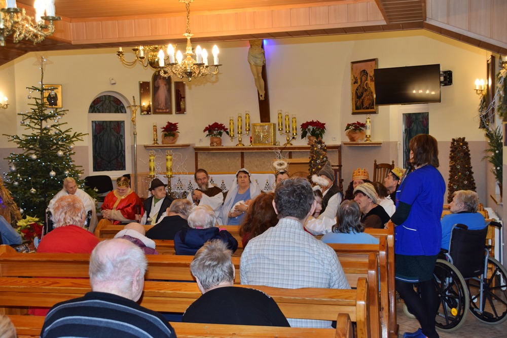 Mieszkańcy Domu, którzy wcielili się w role: Maryi, św. Józefa, Trzech Króli, Aniołów i Pasterzy skutecznie zachęcili zgromadzonych w kaplicy do wspólnego śpiewu i radosnego wychwalania narodzin Dzieciątka Jezus.