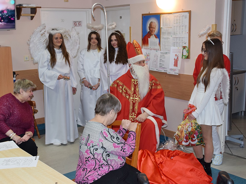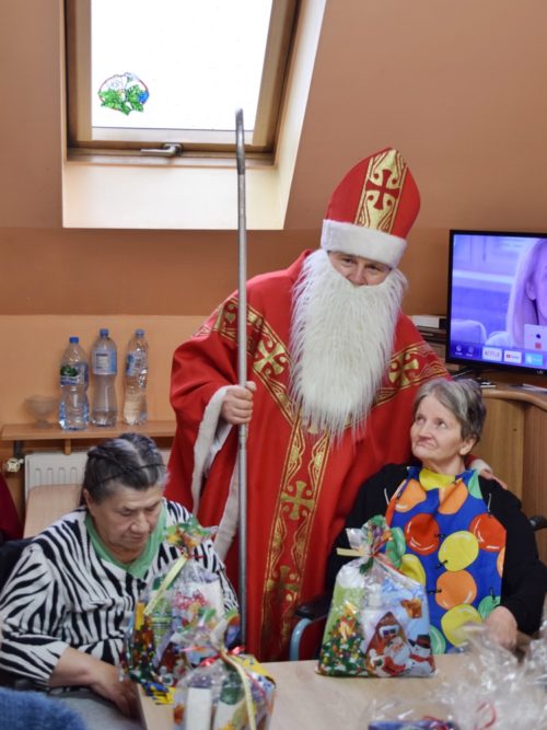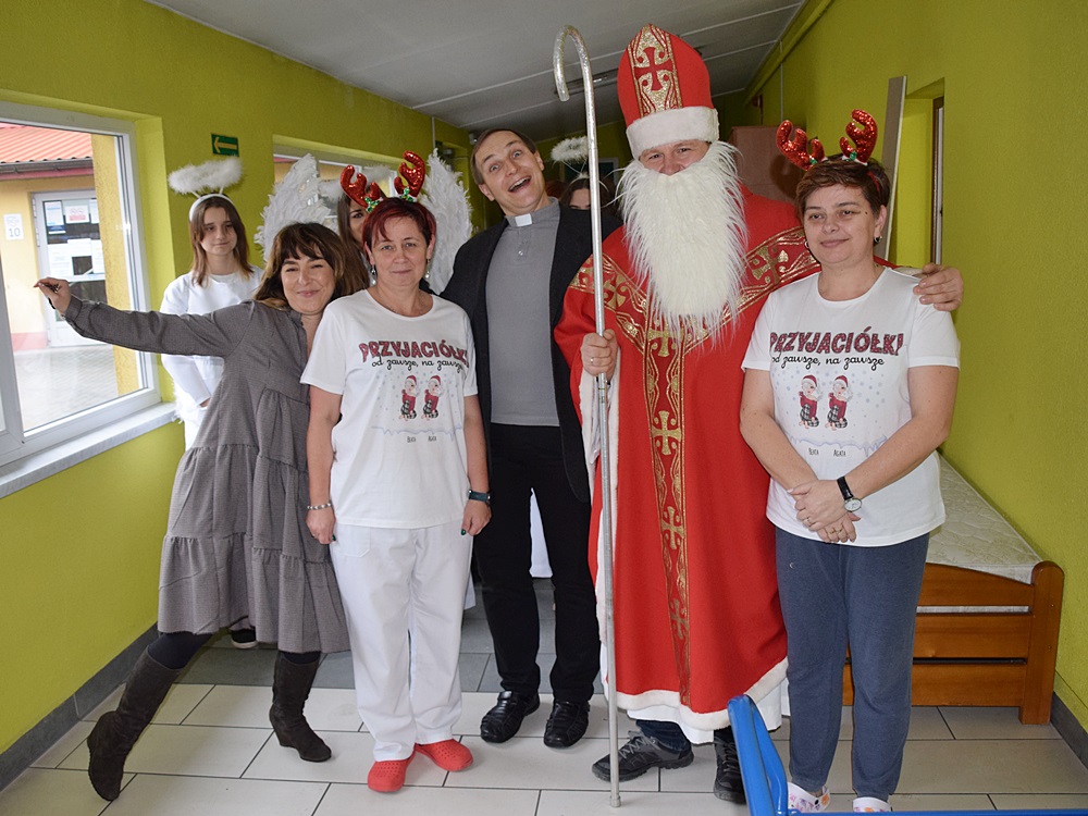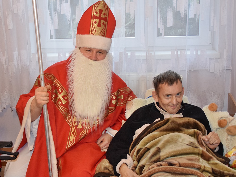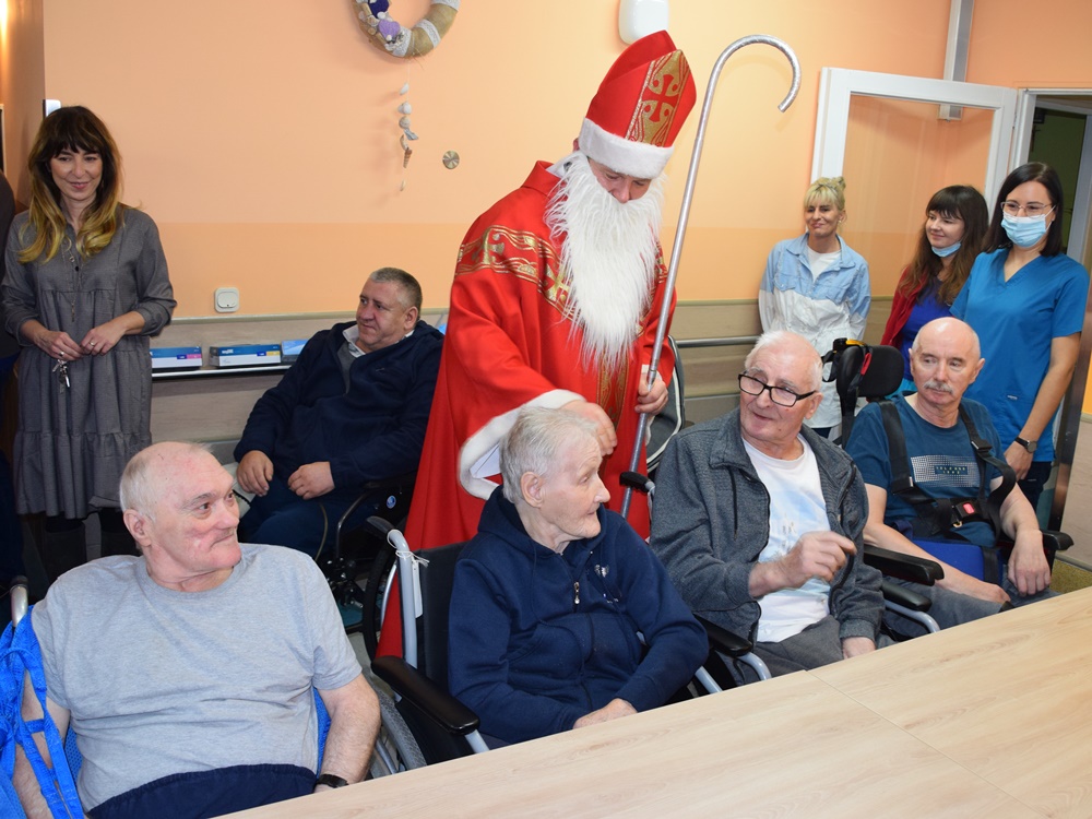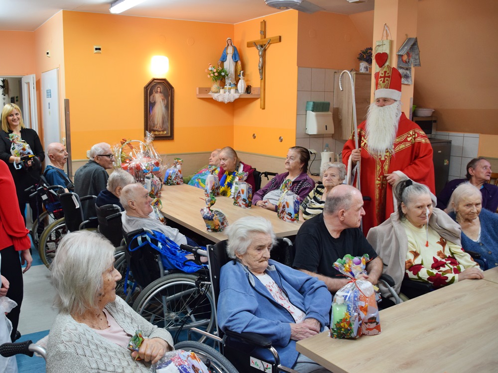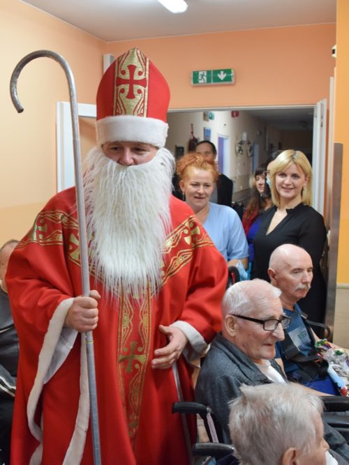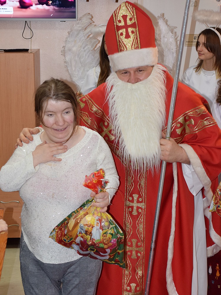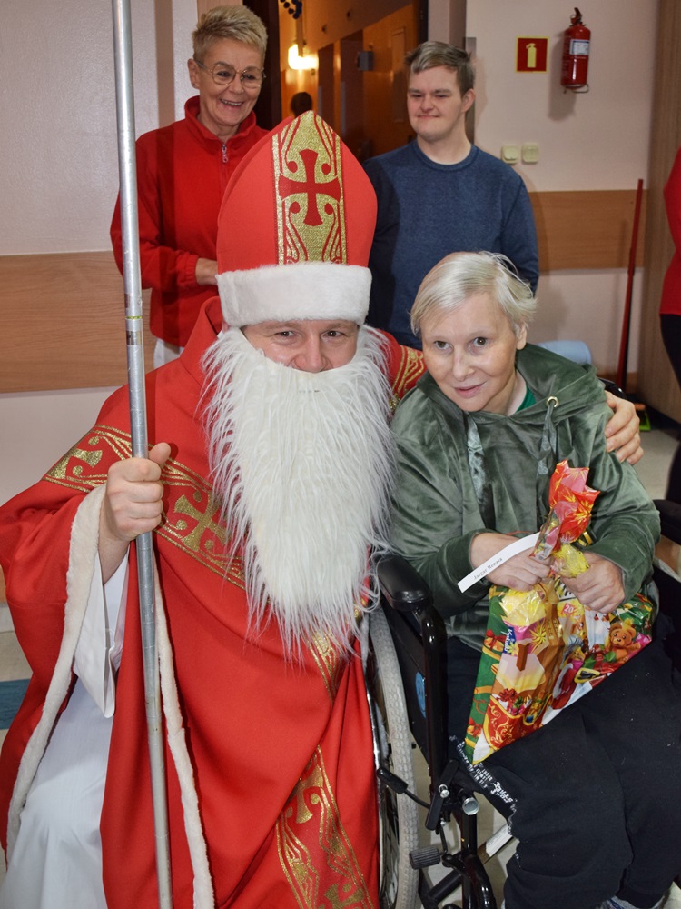 W dniu 06.12.2022 r. nasz ośrodek odwiedził Święty Mikołaj. Towarzyszył mu orszak w składzie: Śnieżynki (w tej roli wystąpiły wolontariuszki-uczennice zatorskiego Wielozawodowego Zespołu Szkół) oraz nasi pracownicy. Oprawę muzyczną zapewniła nam wolontariuszka Agnieszka. Święty Mikołaj ubrany w tradycyjny strój biskupi, z pastorałem i workiem pełnym prezentów był zaskoczeniem dla wszystkich podopiecznych. Odwiedził poszczególne grupy Domu Pomocy Społecznej oraz Zakład Opiekuńczo-Leczniczy, wręczając mieszkańcom oraz pacjentom drobne upominki. Spotkanie ze Świętym Mikołajem wywołało wielką radość, uśmiech i wzruszenie wśród naszych podopiecznych. Postać Świętego Mikołaja w jakimś sensie ożywia uśpioną w nas dziecięcość, potrzebę wiary, że jest gdzieś ktoś, kto o nas myśli, zna nasze najskrytsze, największe marzenia i pragnie je spełnić, że dla tego kogoś jesteśmy ważni bez względu na to, czy jesteśmy bardziej, czy mniej utalentowani i dla kogo nie ma absolutnie żadnego znaczenia, czy dobrze radzimy sobie w życiu. To postać, która odpowiada na naszą potrzebę bycia dostrzeżonym, docenionym i bezinteresownie obdarowanym. Święty Mikołaj nie zapomniał także wręczyć słodyczy pracownikom obecnym w tym dniu w pracy jak również powiedział miłe słowo, które wywołało wśród nich uśmiech. Na koniec spotkania zrobiliśmy pamiątkowe zdjęcia, które będą nam przypominać o tym radosnym dniu w naszym Ośrodku.