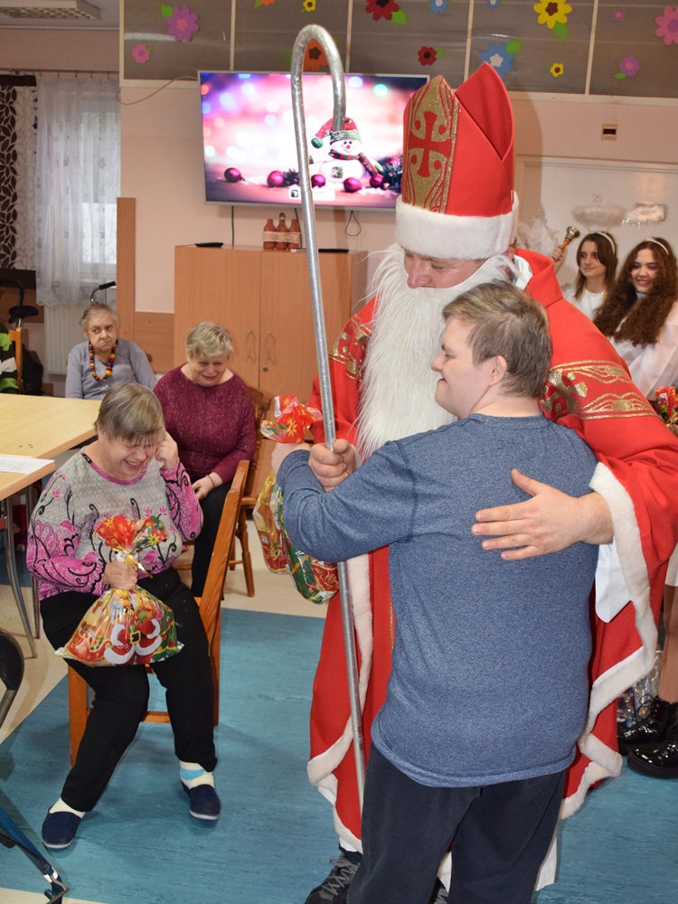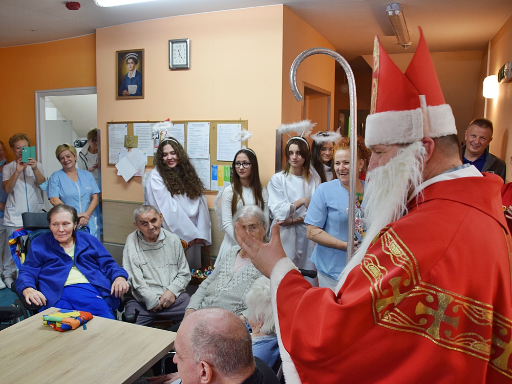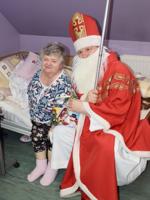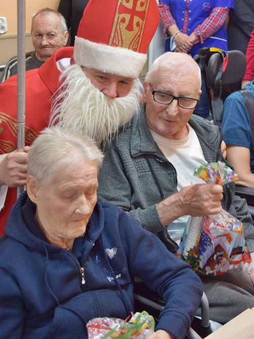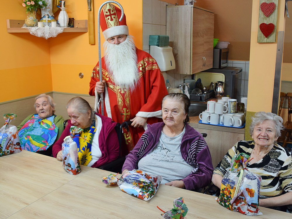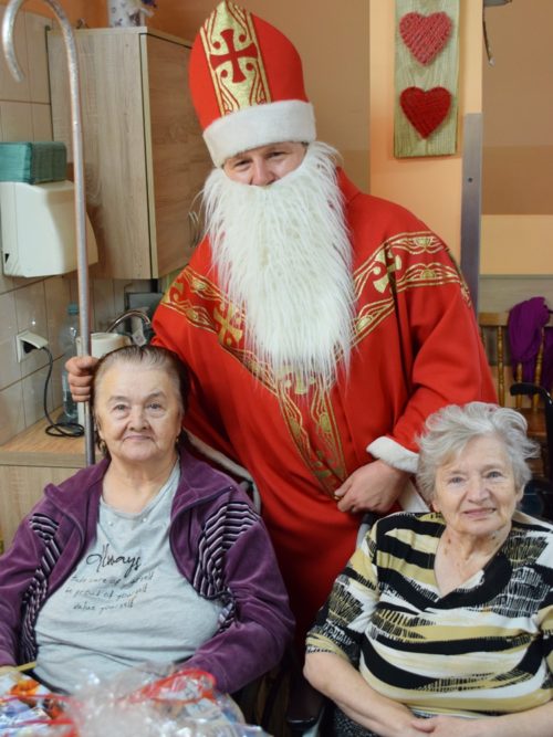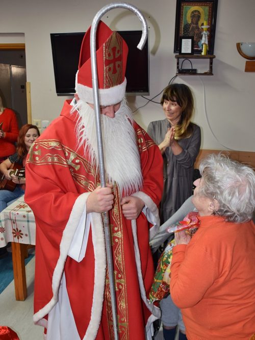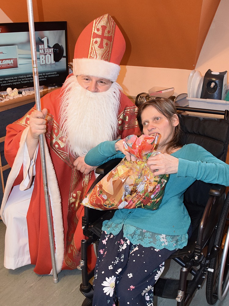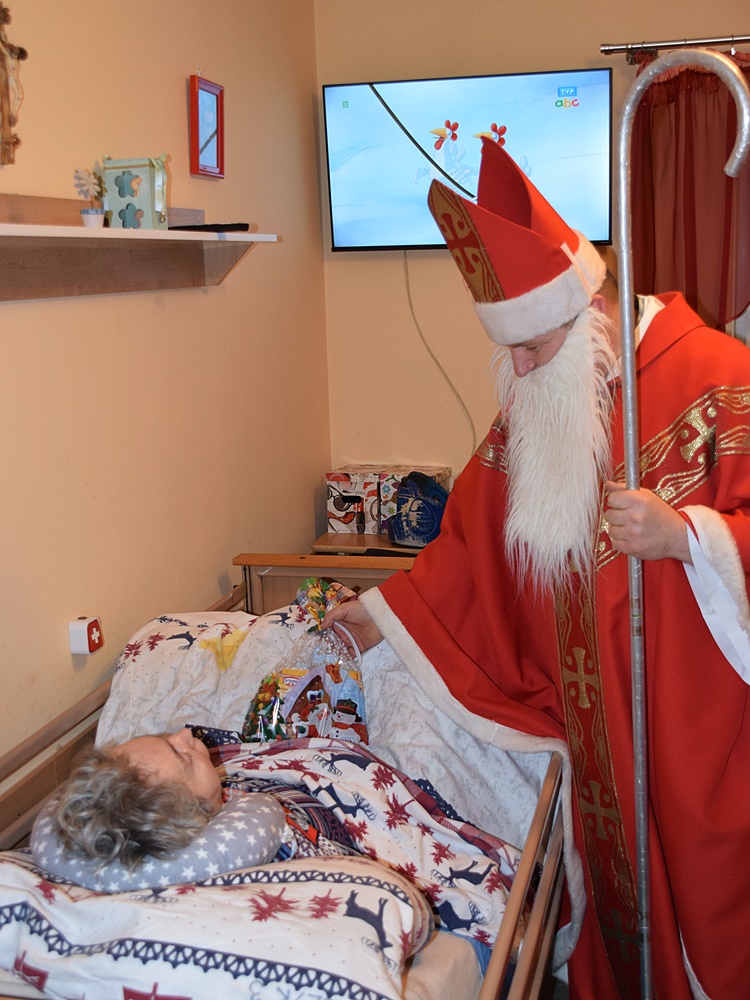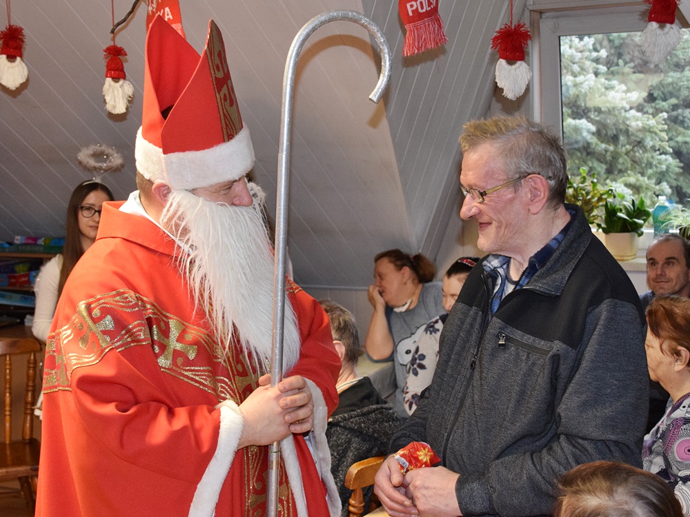 W dniu 06.12.2022 r. nasz ośrodek odwiedził Święty Mikołaj. Towarzyszył mu orszak w składzie: Śnieżynki (w tej roli wystąpiły wolontariuszki-uczennice zatorskiego Wielozawodowego Zespołu Szkół) oraz nasi pracownicy. Oprawę muzyczną zapewniła nam wolontariuszka Agnieszka. Święty Mikołaj ubrany w tradycyjny strój biskupi, z pastorałem i workiem pełnym prezentów był zaskoczeniem dla wszystkich podopiecznych. Odwiedził poszczególne grupy Domu Pomocy Społecznej oraz Zakład Opiekuńczo-Leczniczy, wręczając mieszkańcom oraz pacjentom drobne upominki. Spotkanie ze Świętym Mikołajem wywołało wielką radość, uśmiech i wzruszenie wśród naszych podopiecznych. Postać Świętego Mikołaja w jakimś sensie ożywia uśpioną w nas dziecięcość, potrzebę wiary, że jest gdzieś ktoś, kto o nas myśli, zna nasze najskrytsze, największe marzenia i pragnie je spełnić, że dla tego kogoś jesteśmy ważni bez względu na to, czy jesteśmy bardziej, czy mniej utalentowani i dla kogo nie ma absolutnie żadnego znaczenia, czy dobrze radzimy sobie w życiu. To postać, która odpowiada na naszą potrzebę bycia dostrzeżonym, docenionym i bezinteresownie obdarowanym. Święty Mikołaj nie zapomniał także wręczyć słodyczy pracownikom obecnym w tym dniu w pracy jak również powiedział miłe słowo, które wywołało wśród nich uśmiech. Na koniec spotkania zrobiliśmy pamiątkowe zdjęcia, które będą nam przypominać o tym radosnym dniu w naszym Ośrodku.