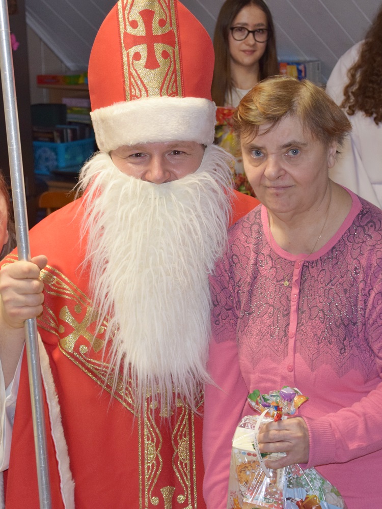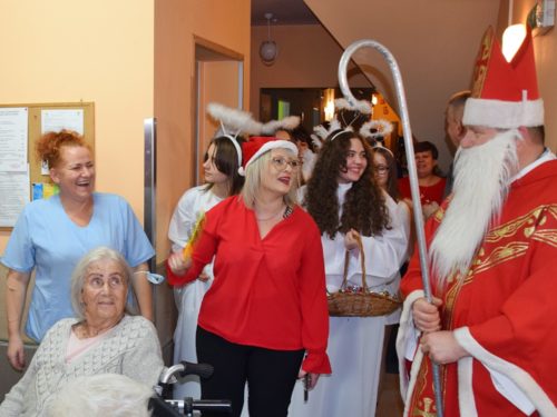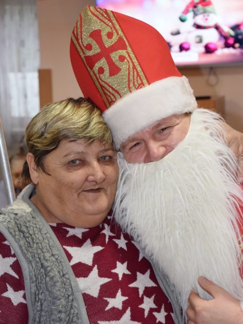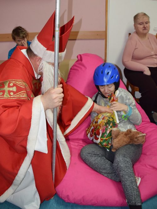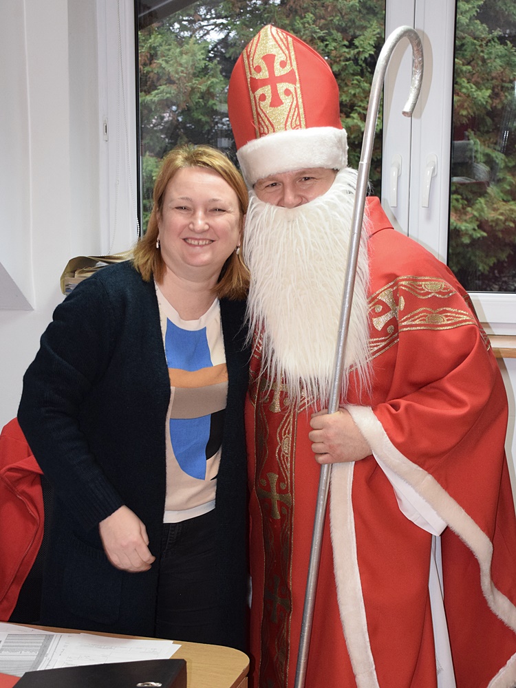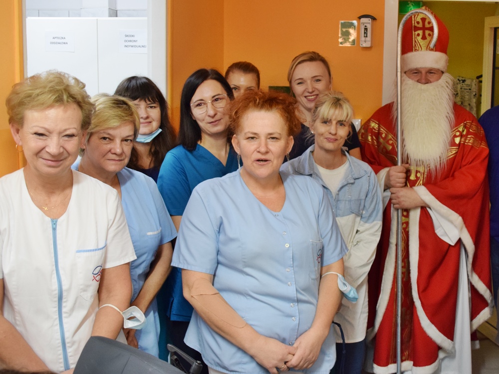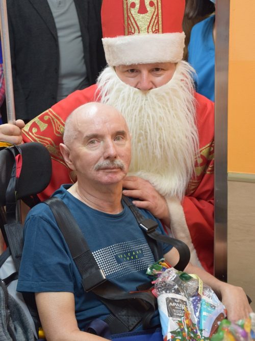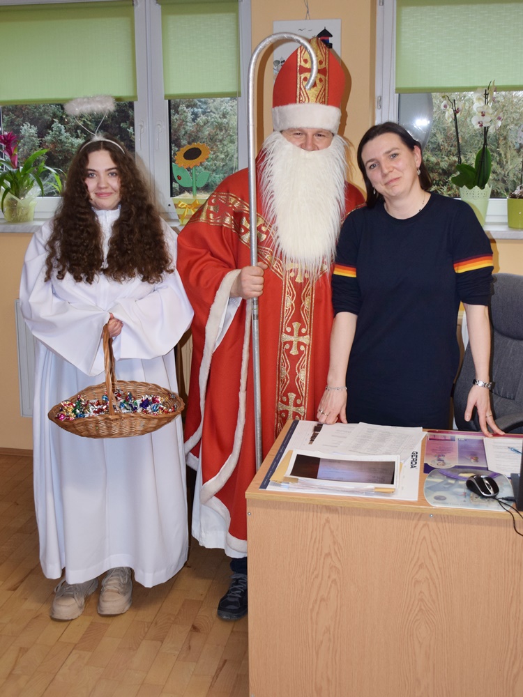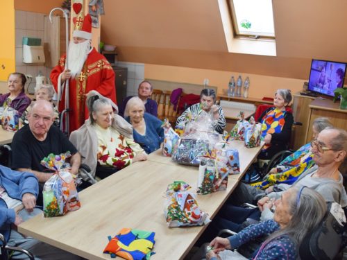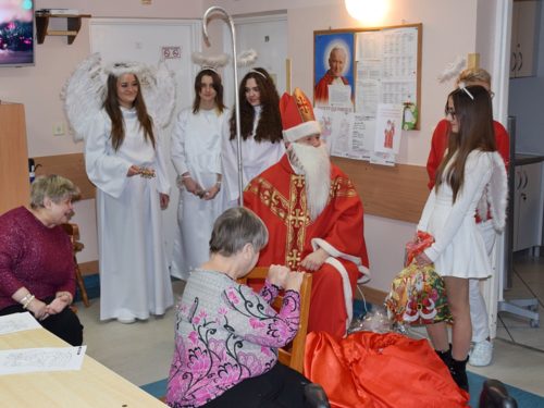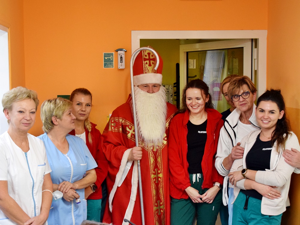 W dniu 06.12.2022 r. nasz ośrodek odwiedził Święty Mikołaj. Towarzyszył mu orszak w składzie: Śnieżynki (w tej roli wystąpiły wolontariuszki-uczennice zatorskiego Wielozawodowego Zespołu Szkół) oraz nasi pracownicy. Oprawę muzyczną zapewniła nam wolontariuszka Agnieszka. Święty Mikołaj ubrany w tradycyjny strój biskupi, z pastorałem i workiem pełnym prezentów był zaskoczeniem dla wszystkich podopiecznych. Odwiedził poszczególne grupy Domu Pomocy Społecznej oraz Zakład Opiekuńczo-Leczniczy, wręczając mieszkańcom oraz pacjentom drobne upominki. Spotkanie ze Świętym Mikołajem wywołało wielką radość, uśmiech i wzruszenie wśród naszych podopiecznych. Postać Świętego Mikołaja w jakimś sensie ożywia uśpioną w nas dziecięcość, potrzebę wiary, że jest gdzieś ktoś, kto o nas myśli, zna nasze najskrytsze, największe marzenia i pragnie je spełnić, że dla tego kogoś jesteśmy ważni bez względu na to, czy jesteśmy bardziej, czy mniej utalentowani i dla kogo nie ma absolutnie żadnego znaczenia, czy dobrze radzimy sobie w życiu. To postać, która odpowiada na naszą potrzebę bycia dostrzeżonym, docenionym i bezinteresownie obdarowanym. Święty Mikołaj nie zapomniał także wręczyć słodyczy pracownikom obecnym w tym dniu w pracy jak również powiedział miłe słowo, które wywołało wśród nich uśmiech. Na koniec spotkania zrobiliśmy pamiątkowe zdjęcia, które będą nam przypominać o tym radosnym dniu w naszym Ośrodku.