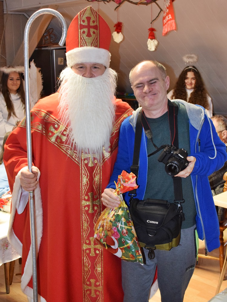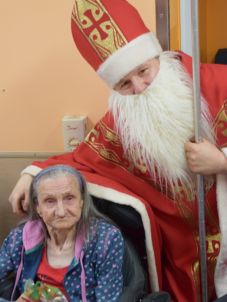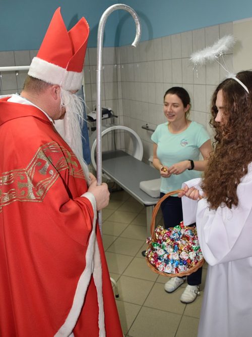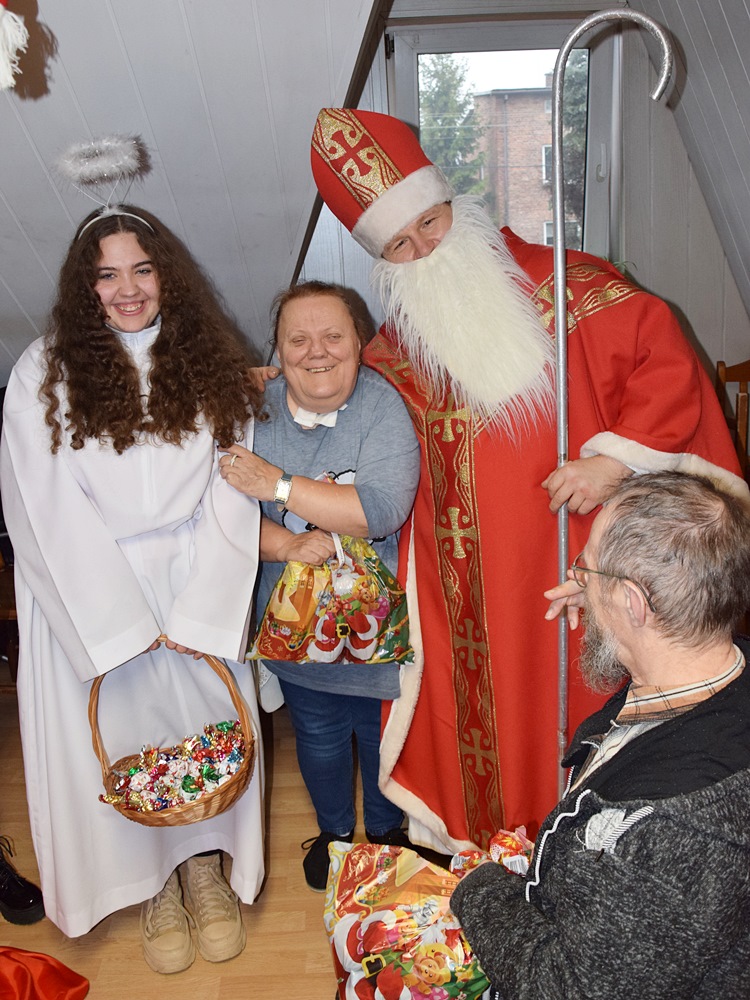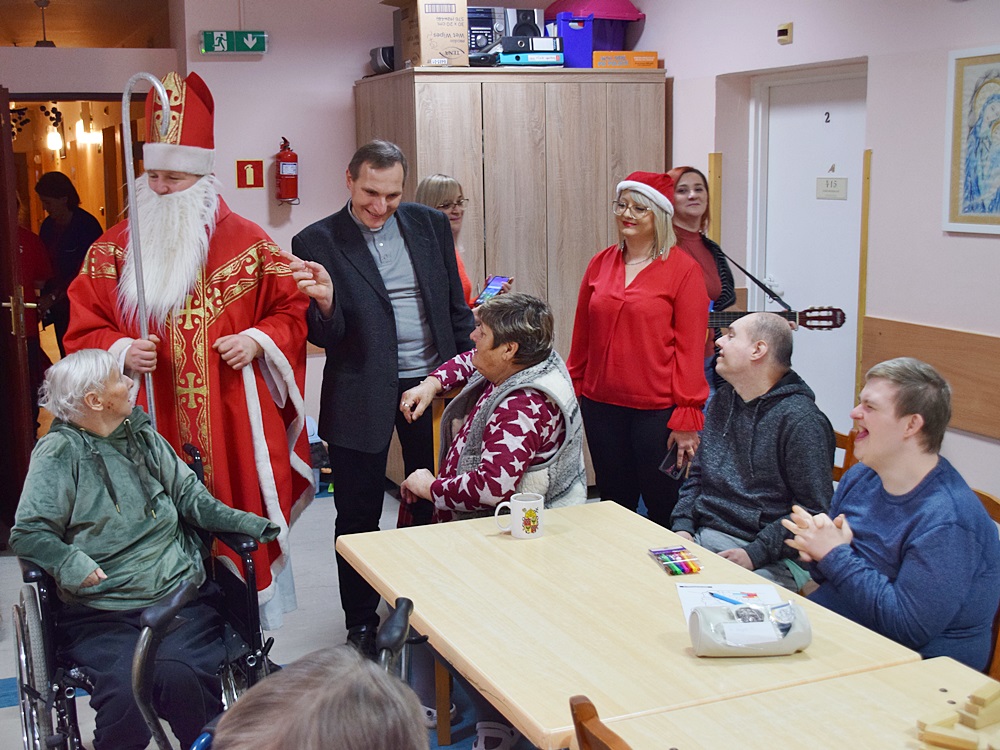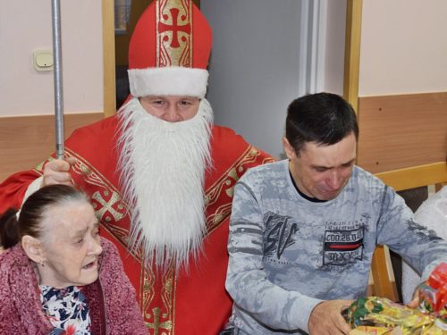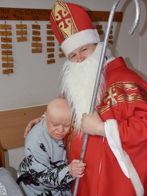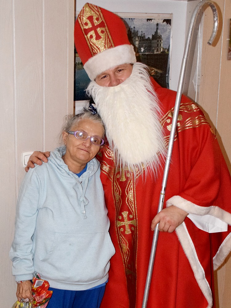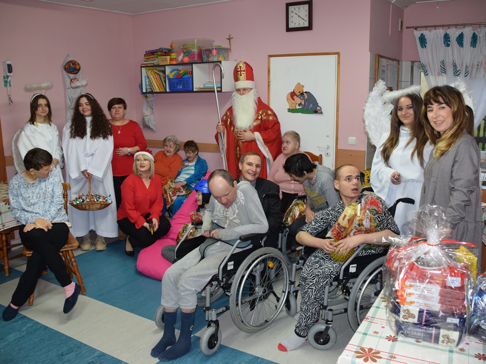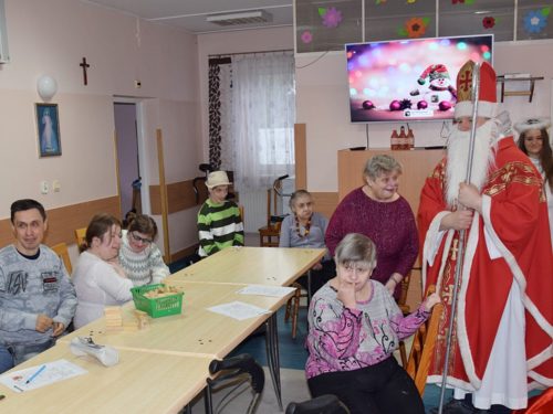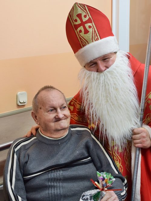 W dniu 06.12.2022 r. nasz ośrodek odwiedził Święty Mikołaj. Towarzyszył mu orszak w składzie: Śnieżynki (w tej roli wystąpiły wolontariuszki-uczennice zatorskiego Wielozawodowego Zespołu Szkół) oraz nasi pracownicy. Oprawę muzyczną zapewniła nam wolontariuszka Agnieszka. Święty Mikołaj ubrany w tradycyjny strój biskupi, z pastorałem i workiem pełnym prezentów był zaskoczeniem dla wszystkich podopiecznych. Odwiedził poszczególne grupy Domu Pomocy Społecznej oraz Zakład Opiekuńczo-Leczniczy, wręczając mieszkańcom oraz pacjentom drobne upominki. Spotkanie ze Świętym Mikołajem wywołało wielką radość, uśmiech i wzruszenie wśród naszych podopiecznych. Postać Świętego Mikołaja w jakimś sensie ożywia uśpioną w nas dziecięcość, potrzebę wiary, że jest gdzieś ktoś, kto o nas myśli, zna nasze najskrytsze, największe marzenia i pragnie je spełnić, że dla tego kogoś jesteśmy ważni bez względu na to, czy jesteśmy bardziej, czy mniej utalentowani i dla kogo nie ma absolutnie żadnego znaczenia, czy dobrze radzimy sobie w życiu. To postać, która odpowiada na naszą potrzebę bycia dostrzeżonym, docenionym i bezinteresownie obdarowanym. Święty Mikołaj nie zapomniał także wręczyć słodyczy pracownikom obecnym w tym dniu w pracy jak również powiedział miłe słowo, które wywołało wśród nich uśmiech. Na koniec spotkania zrobiliśmy pamiątkowe zdjęcia, które będą nam przypominać o tym radosnym dniu w naszym Ośrodku.
