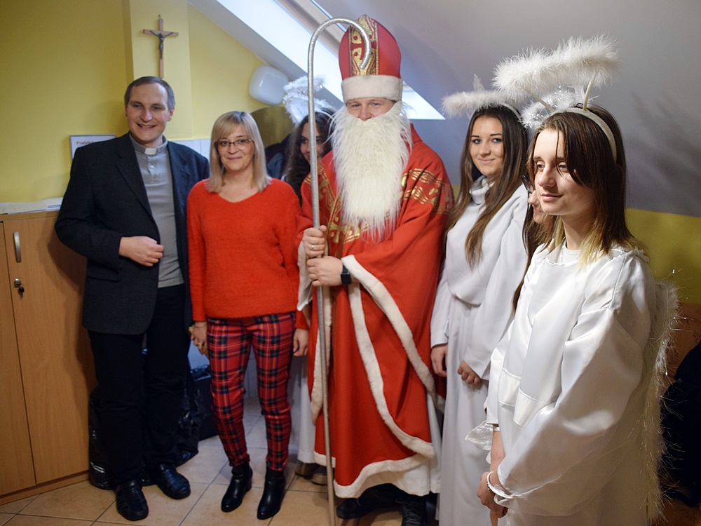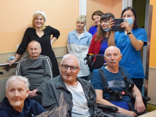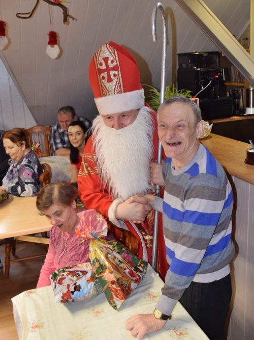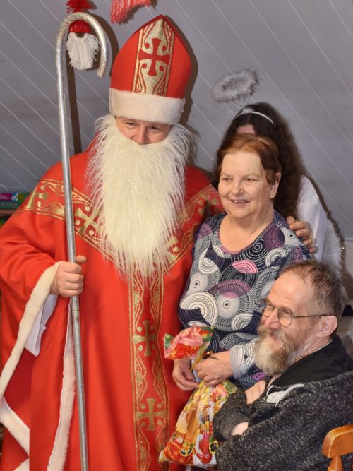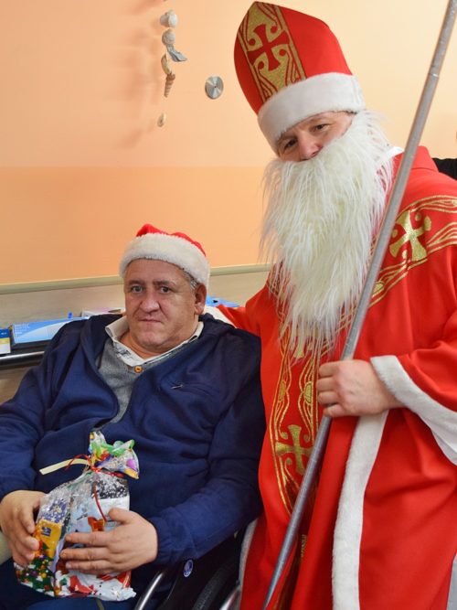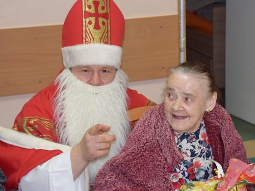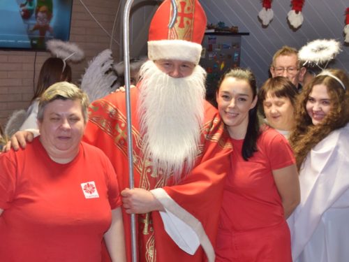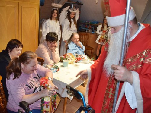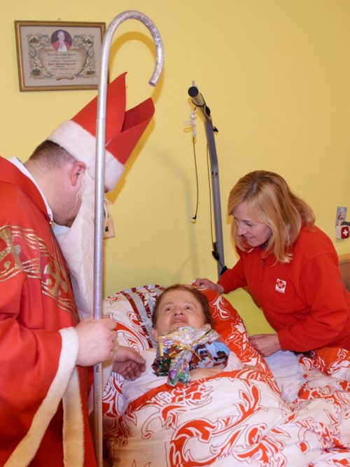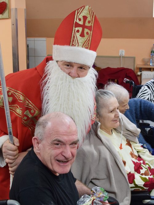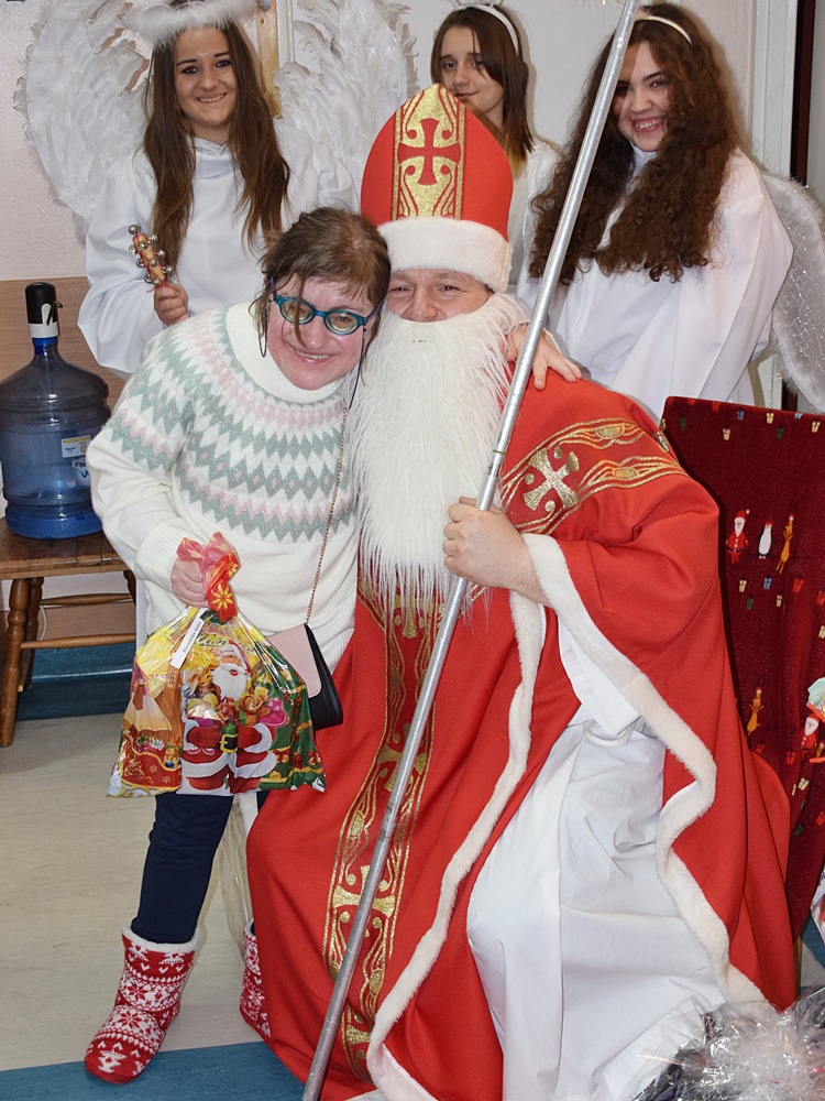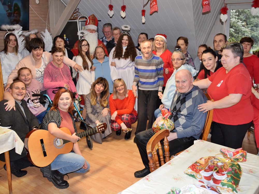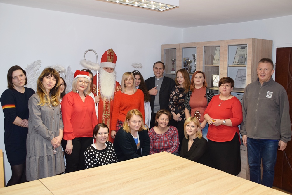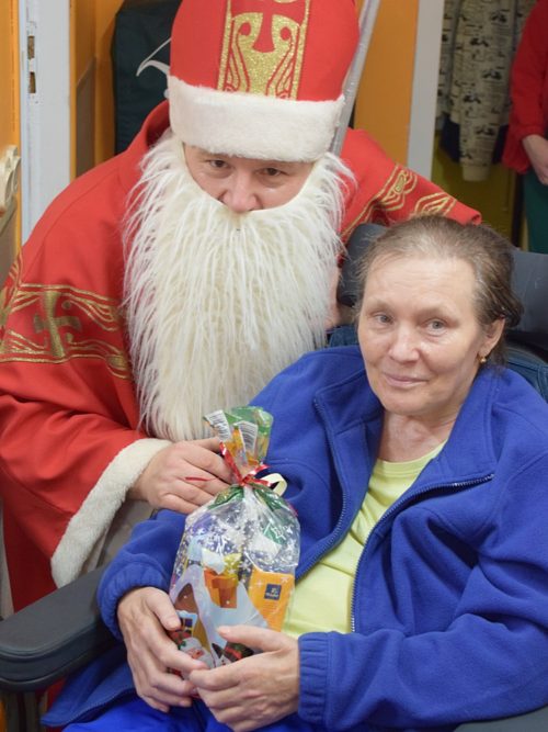 W dniu 06.12.2022 r. nasz ośrodek odwiedził Święty Mikołaj. Towarzyszył mu orszak w składzie: Śnieżynki (w tej roli wystąpiły wolontariuszki-uczennice zatorskiego Wielozawodowego Zespołu Szkół) oraz nasi pracownicy. Oprawę muzyczną zapewniła nam wolontariuszka Agnieszka. Święty Mikołaj ubrany w tradycyjny strój biskupi, z pastorałem i workiem pełnym prezentów był zaskoczeniem dla wszystkich podopiecznych. Odwiedził poszczególne grupy Domu Pomocy Społecznej oraz Zakład Opiekuńczo-Leczniczy, wręczając mieszkańcom oraz pacjentom drobne upominki. Spotkanie ze Świętym Mikołajem wywołało wielką radość, uśmiech i wzruszenie wśród naszych podopiecznych. Postać Świętego Mikołaja w jakimś sensie ożywia uśpioną w nas dziecięcość, potrzebę wiary, że jest gdzieś ktoś, kto o nas myśli, zna nasze najskrytsze, największe marzenia i pragnie je spełnić, że dla tego kogoś jesteśmy ważni bez względu na to, czy jesteśmy bardziej, czy mniej utalentowani i dla kogo nie ma absolutnie żadnego znaczenia, czy dobrze radzimy sobie w życiu. To postać, która odpowiada na naszą potrzebę bycia dostrzeżonym, docenionym i bezinteresownie obdarowanym. Święty Mikołaj nie zapomniał także wręczyć słodyczy pracownikom obecnym w tym dniu w pracy jak również powiedział miłe słowo, które wywołało wśród nich uśmiech. Na koniec spotkania zrobiliśmy pamiątkowe zdjęcia, które będą nam przypominać o tym radosnym dniu w naszym Ośrodku.