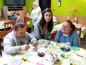 W grudniowe wtorkowe popołudnie wolontariusze- uczniowie z zatorskiej szkoły podstawowej wraz ze swoimi szkolnymi opiekunkami paniami: Martą Stramecką i Moniką Skowron zorganizowali na terenie naszego ośrodka warsztaty świąteczne. To kolejna propozycja wolontariuszy na wspólne spędzenie czasu, rozwijanie kontaktów i tworzenie – tym razem świątecznych ozdób. Mieszkańcy DPS i pacjenci ZOL we współpracy z uczniami przygotowywali bożonarodzeniowe dekoracje. Część osób skorzystała z pomysłów zaproponowanych przez organizatorów, a niektórzy wykonali autorskie projekty. Spotkanie upłynęło w radosnej atmosferze i wprowadziło nas w świąteczny nastrój.