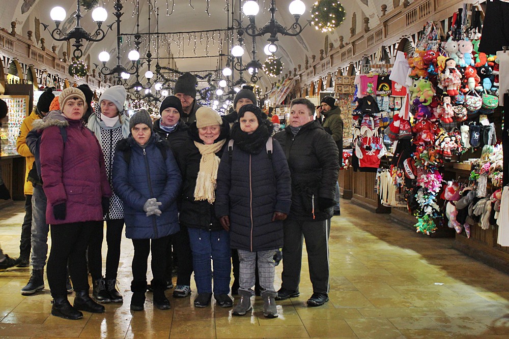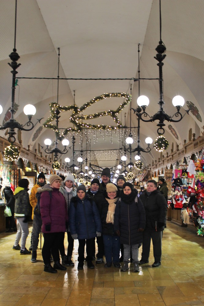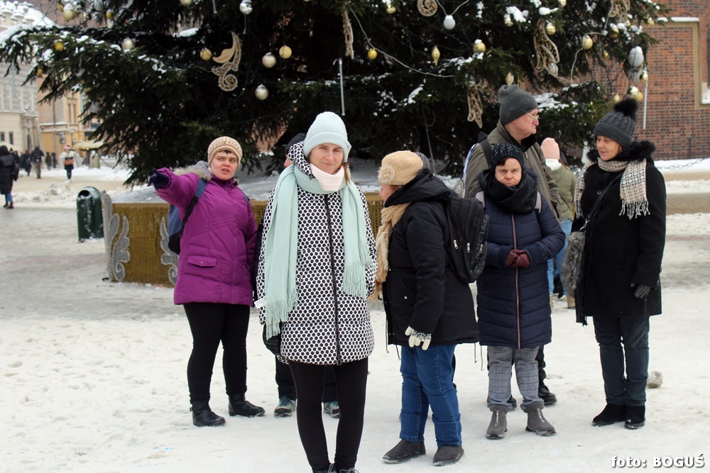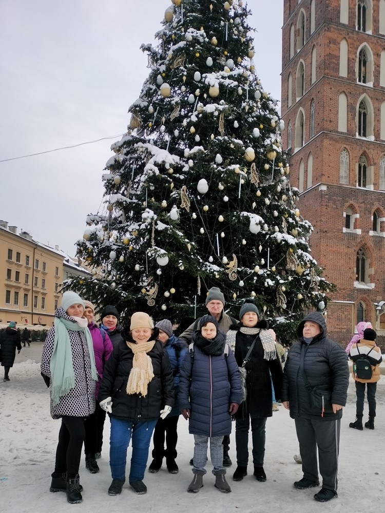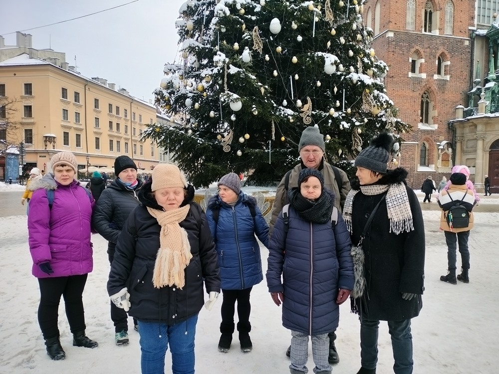 W dniu 14.12.2022 małą grupą mieszkańców wybraliśmy się na całodniową wycieczkę pociągiem do Krakowa. Tam najpierw udaliśmy się do Galerii Krakowskiej na shopping i coś słodkiego. Pomimo bardzo mroźnej pogody spacerkiem udaliśmy się do Rynku, by zobaczyć Jarmark Bożonarodzeniowy, który był naszym głównym celem. Potem przyszedł czas na obiad i tak wspólnie zasiedliśmy przy dużym stole w KFC i zjedliśmy małe co nie co. Gdy się już ściemniło ponownie poszliśmy podziwiać piękną choinkę i światełka rozświetlające cały Rynek. To był dla nas miło spędzony czas.