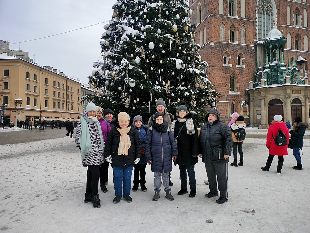 Wycieczka do Krakowa W dniu 14.12.2022 małą grupą mieszkańców wybraliśmy się na całodniową wycieczkę pociągiem do Krakowa. Tam najpierw udaliśmy się do Galerii Krakowskiej na shopping i coś słodkiego. Pomimo bardzo mroźnej pogody spacerkiem udaliśmy się do Rynku, by zobaczyć Jarmark Bożonarodzeniowy, który był naszym głównym celem. Potem przyszedł czas na obiad i tak wspólnie zasiedliśmy przy dużym stole…